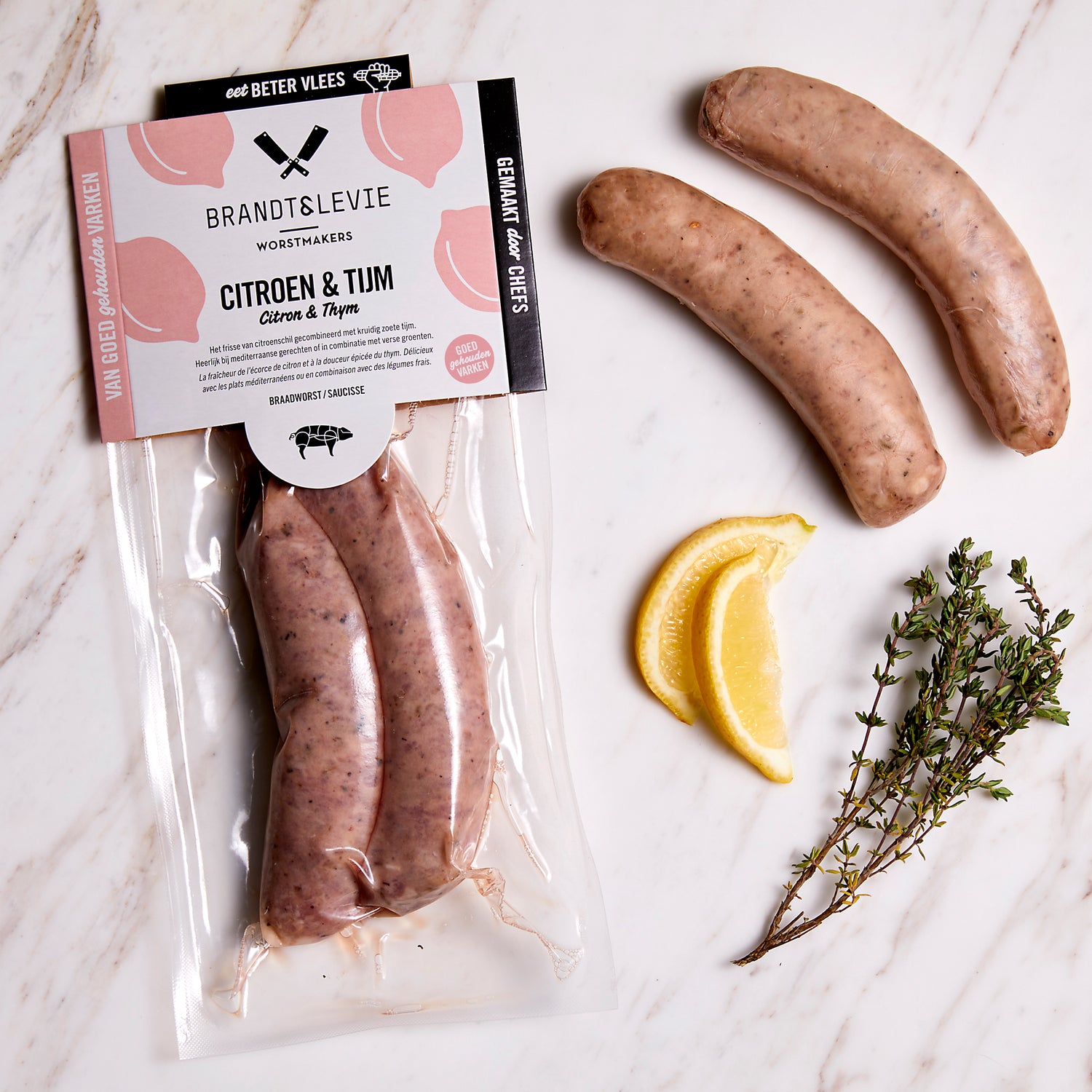 Varkensvlees (96%), zeezout, witte wijn, citroenzest (<1%), conserveermiddel (gebufferd azijn), zwarte peper, tijm (<1%), knoflook, nootmuskaat, zoete paprika, varkensdarm.